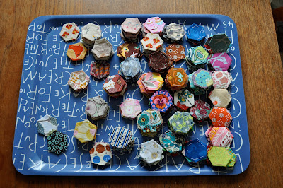 I am using each fabric in my stash about three times and now I'm all out of fabric! I have bought a couple of scrap packs online and can't wait to turn these DELICIOUS fabrics into hexagons.